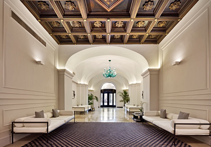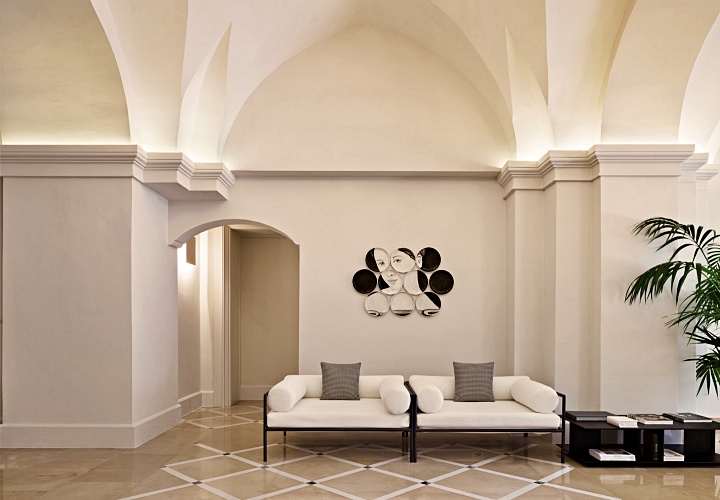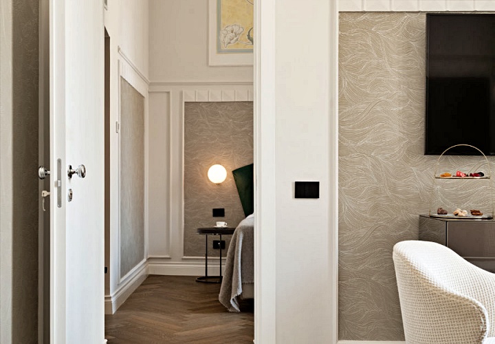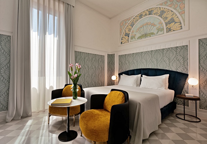 18세기의 화려한 프레스코 천장화와 투박하면서도 멋스러운 나무 서까가 객실의 골조를 이루고, 그 안에 정갈하고 현대적인 가구를 배치하여 시간을 초월한 우아함을 연출하고 있습니다.